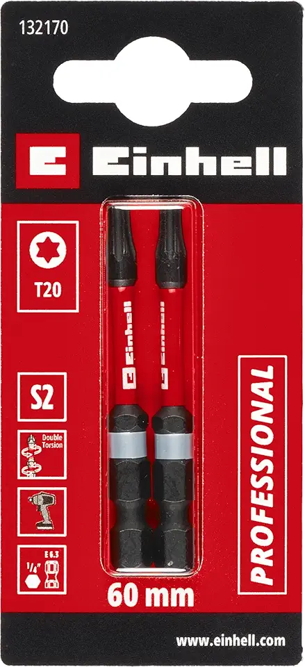 Orijinal Einhell Çift Torsiyonlu Darbeli Bit Seti, 2 Parça, 60 mm, T20 (S2 Çelik, Yüksek Dayanıklılık, Çift Torsiyon Etkisi, Kırmızı Renk Halkası, E 6.3 Sap) - 49132170