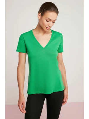 Ethiquet Mabel Kadın 100% Pamuk V Yaka Yarım Kollu Yeşil T-Shirt