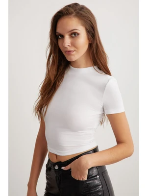 Grimelange Nıara Kadın Pamuk Elastan Bisiklet Yaka Kısa Kollu Slim Fit Crop Beyaz Büstiyer