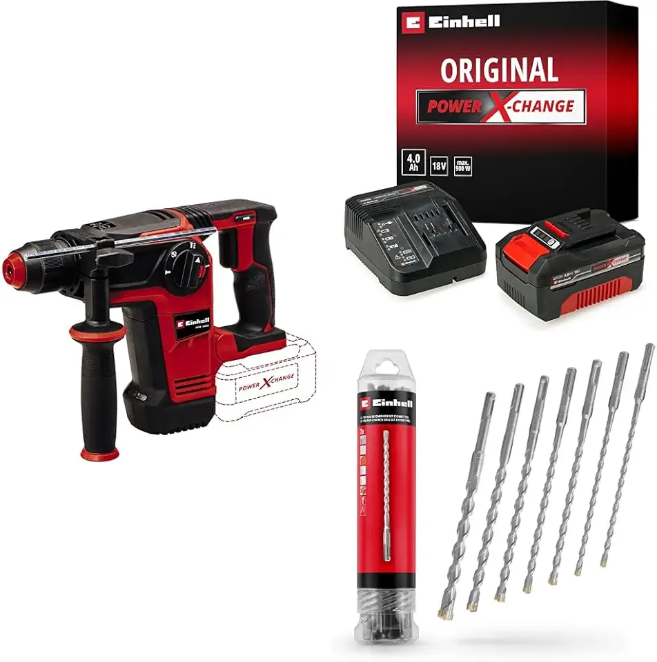 Einhell TP-HD 18/26 Li BL - Solo, Kömürsüz Akülü Kırıcı Delici + 18V 4,0 Ah PXC Starter Kit, Akü ve Şarj Cihazı + SDS PLUS uç seti 7 parça, 6-14/210 mm