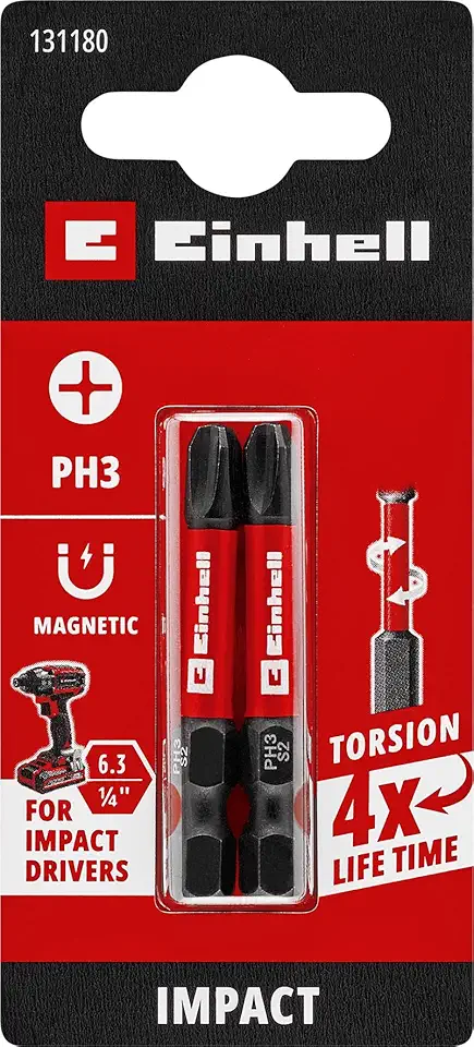 Orijinal Einhell Darbeli Bit Seti, 2 Parça, 50 mm, PH3 (S2 Çelik, Torsiyon Bölgesi, Verimli Güç Aktarımı, Kırmızı Renk Halkası, E 6.3 Sap) - 49131180